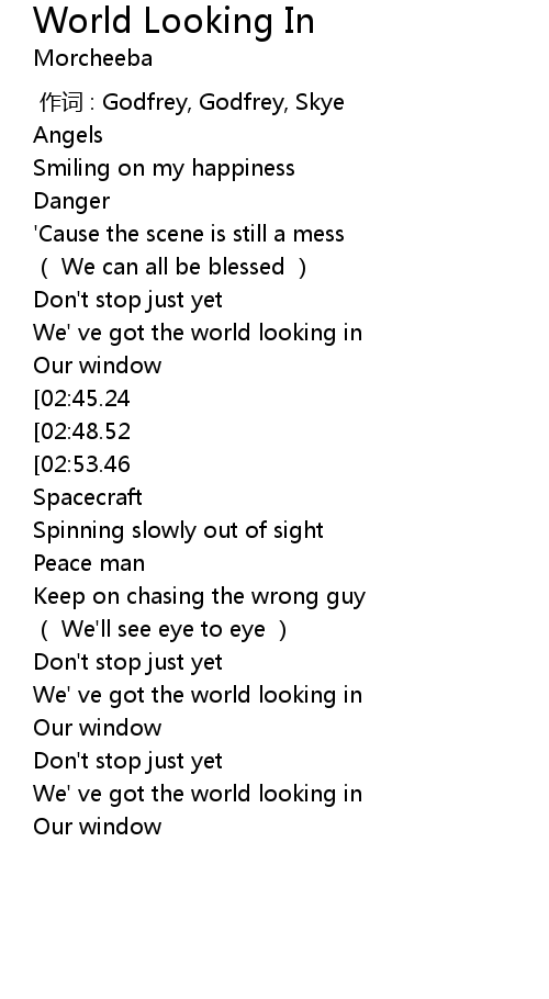 | [02:59.70][02:48.52][01:07.71] | We' ve got the world looking in |