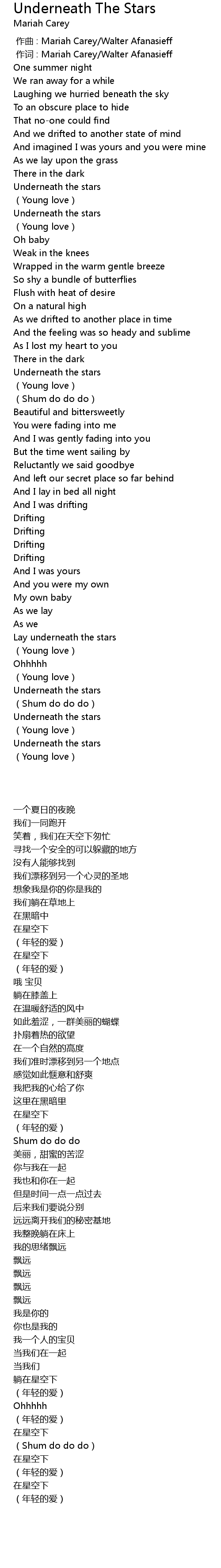 | [00:01.00] | 作词 : Mariah Carey/Walter Afanasieff |