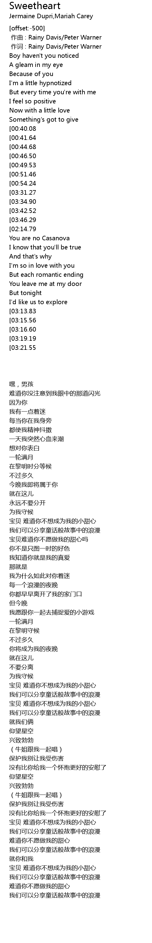 | [03:53.50][03:31.27][01:54.56][00:56.19] | Baby' won' t you be my sweetheart |