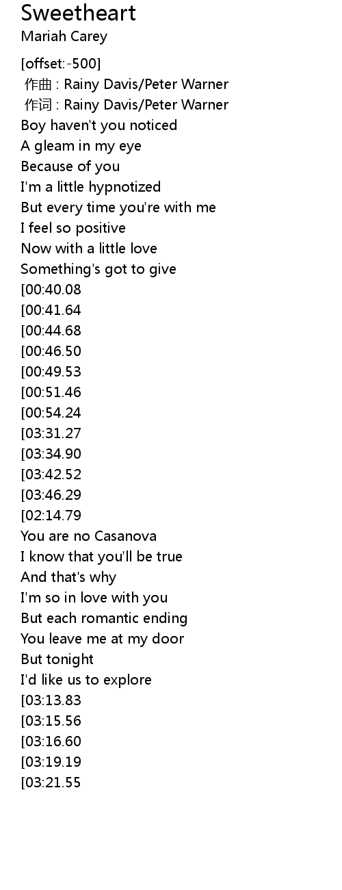 | [03:53.50][03:31.27][01:54.56][00:56.19] | Baby' won't you be my sweetheart |