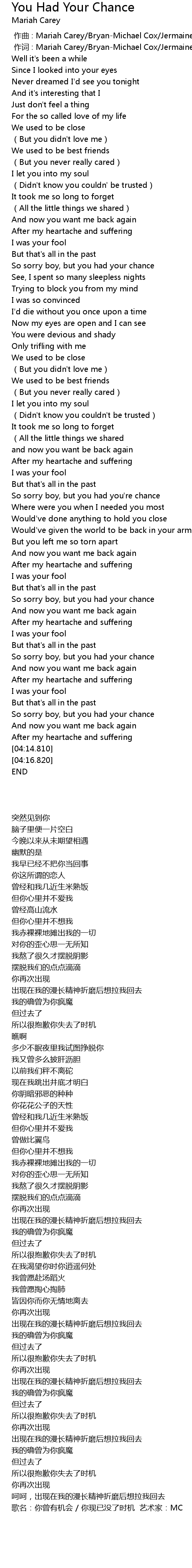 | [04:19.289] | 歌名:你曾有机会 / 你现已没了时机 艺术家:MC |