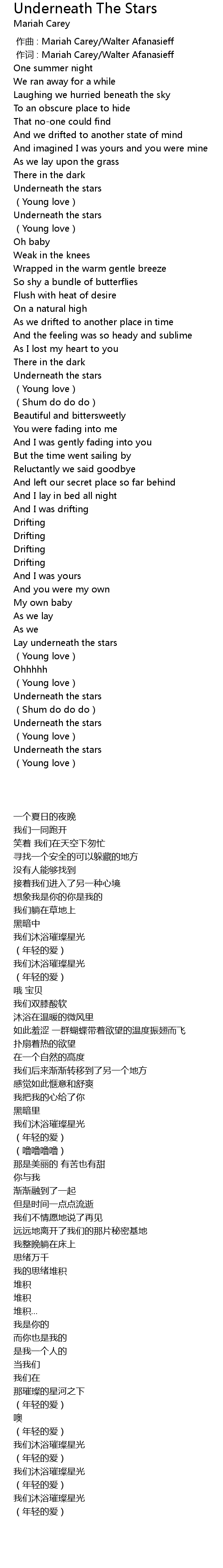 | [00:01.00] | 作词 : Mariah Carey/Walter Afanasieff |