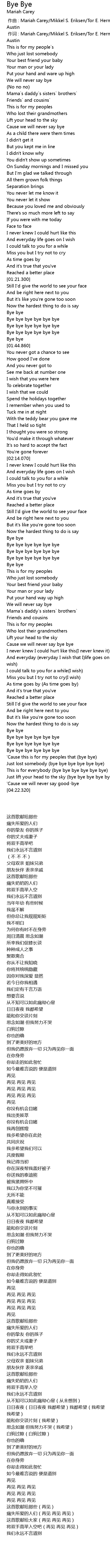 | [00:01.00] | 作词 : Mariah Carey/Mikkel S. Eriksen/Tor E. Hermansen/Johntá Austin |