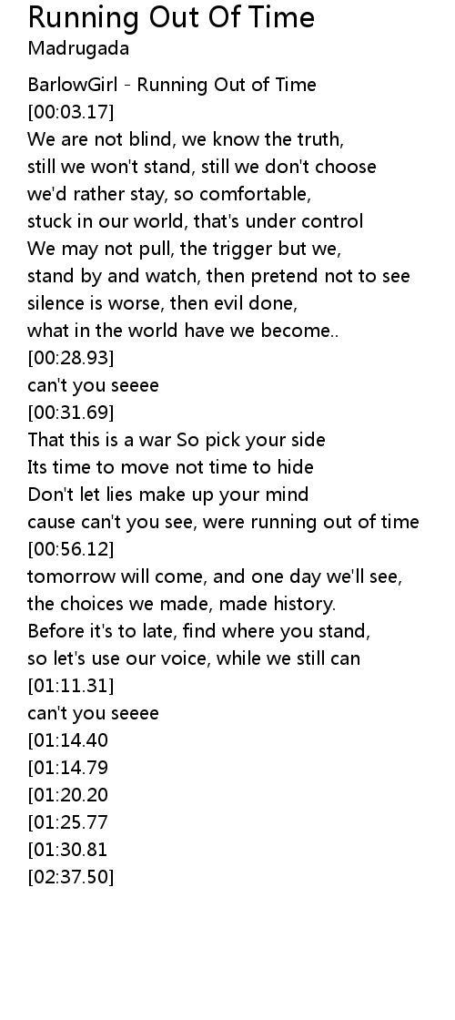 [00:01.12] BarlowGirl - Running Out of Time