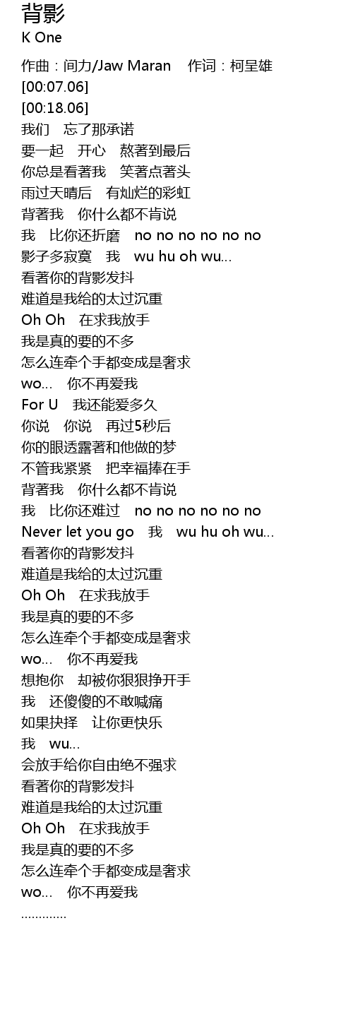 | [00:06.06] | 作曲:间力/Jaw Maran 作词:柯呈雄 |
