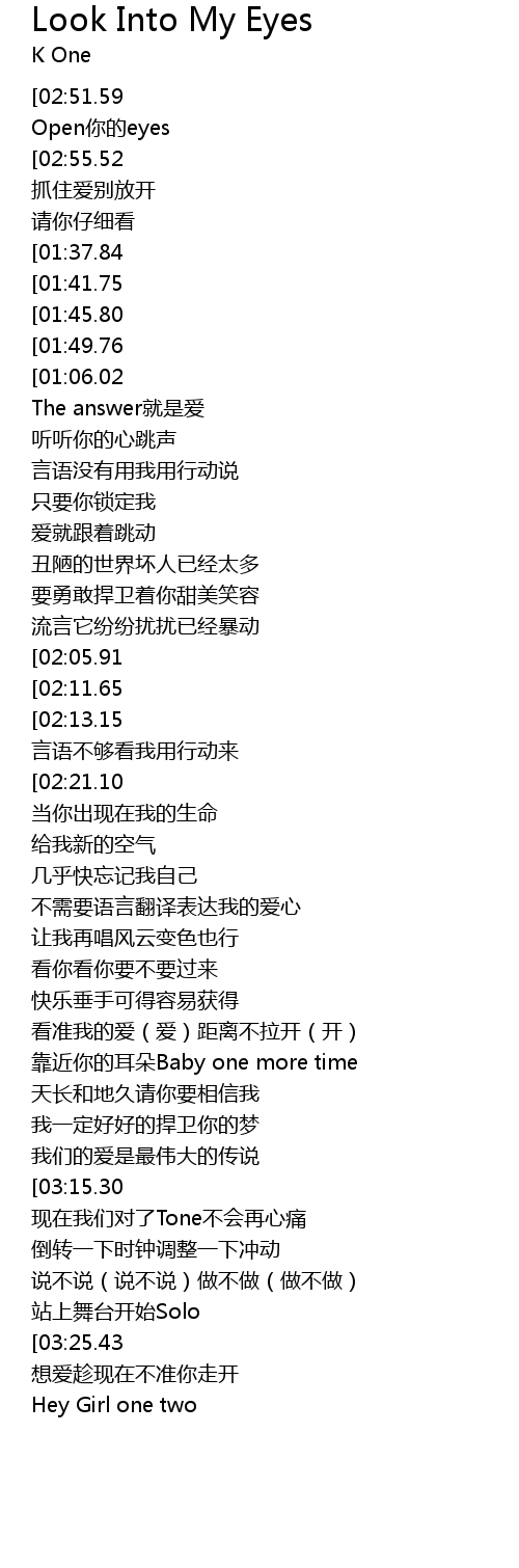| [00:34.31][01:06.02][02:09.80][03:07.40] | Look into my eyes |