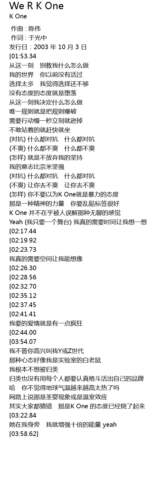 | [01:08.41] | (怎样) 你不要以为K One就是暴力的态度 |