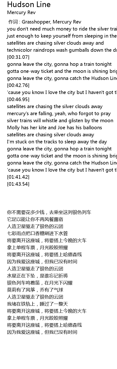 | [01:33.48] | 将要离开这座城,将要搭上哈德森线 |