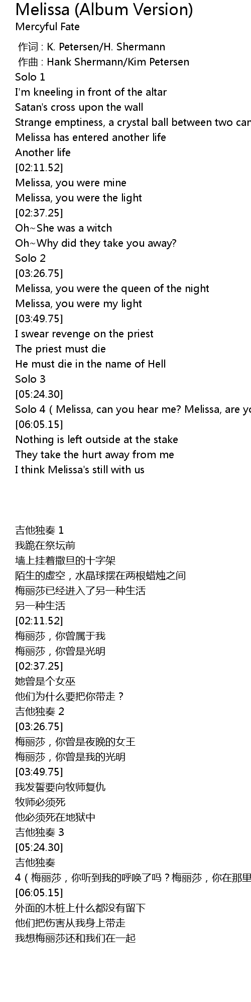 | [05:34.77] | 吉他独奏 4(梅丽莎,你听到我的呼唤了吗?梅丽莎,你在那里吗?) |