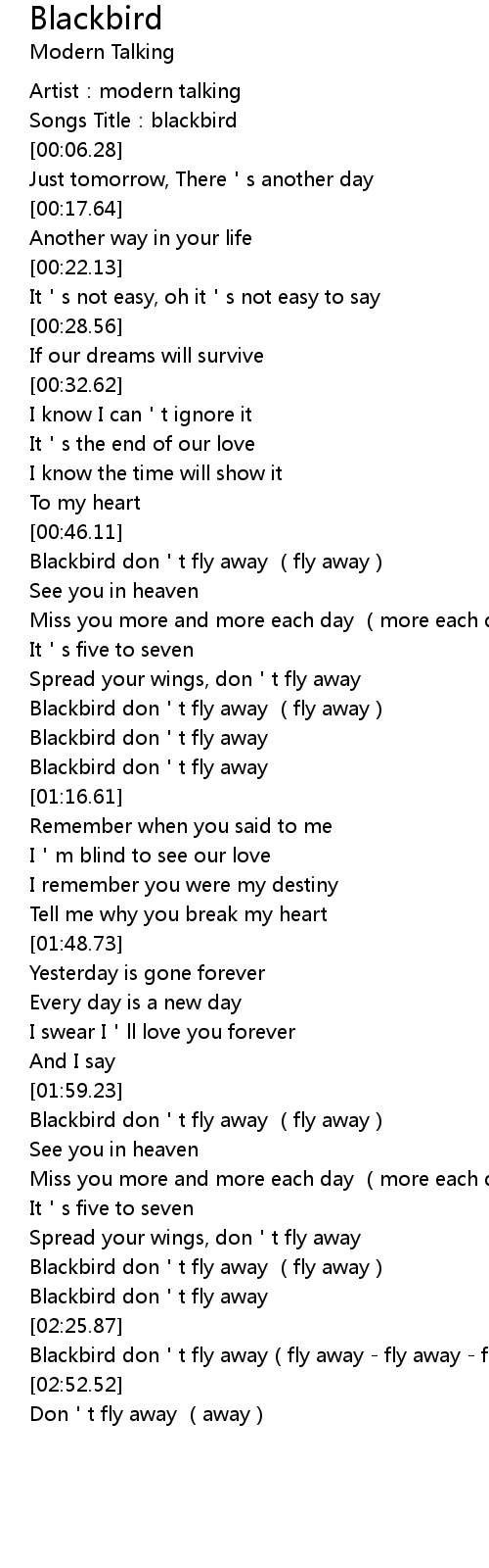 | [02:23.00] | Blackbird don t fly away |