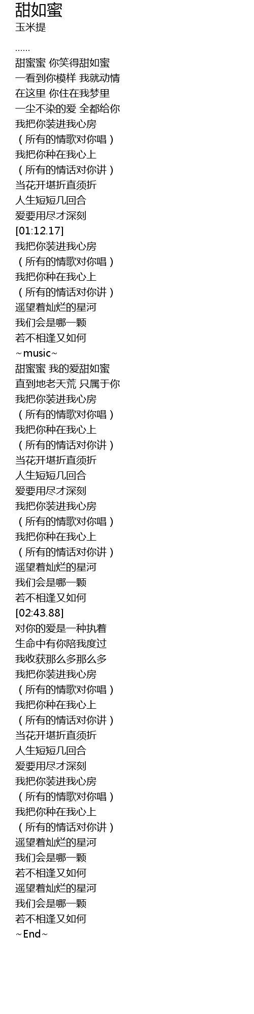 | [01:51.40] | 甜蜜蜜 我的爱甜如蜜 |