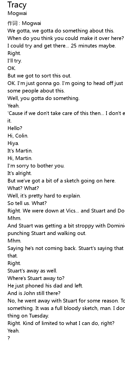 | No, he went away with Stuart for some reason. To try and calm him down or something. It was a full bloody sketch, man. I don' t know what to do. We' ve this thing on Tuesday. | |