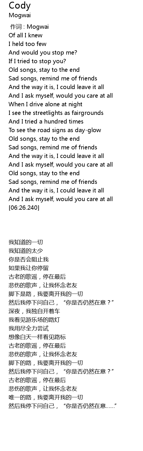 | [01:55.147] | Old songs, stay to the end |