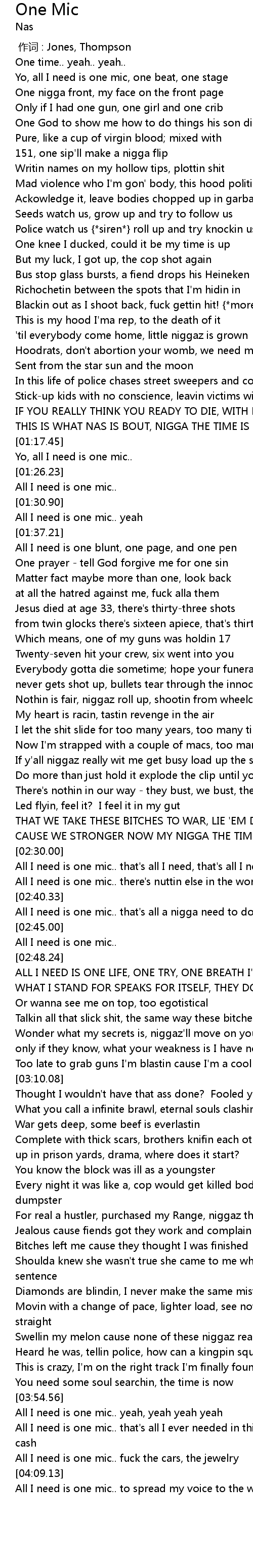 | [02:41.33] | All I need is one mic.. that's all a nigga need to do his thing y'know |