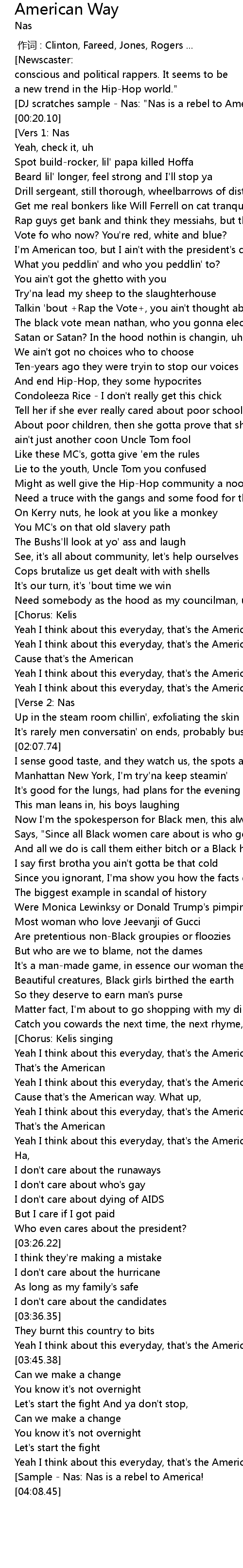 | [00:13.54][DJ scratches sample - Nas: "Nas is a rebel to America" 3X] | |
