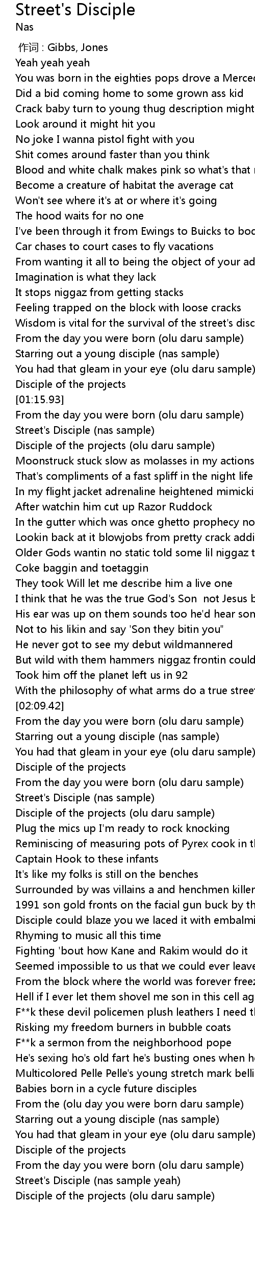 | [03:27.82] | Street's Disciple (nas sample yeah) |
