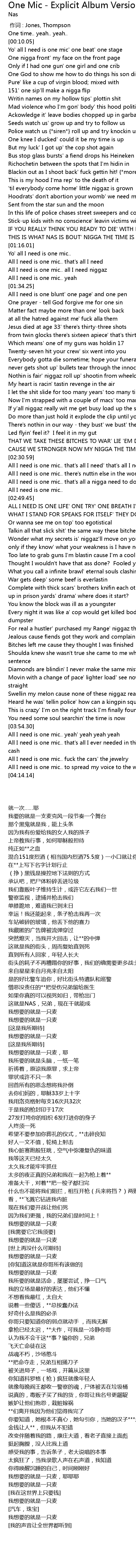 | [01:14.58] | THIS IS WHAT NAS IS BOUT' NIGGA THE TIME IS NOW! |