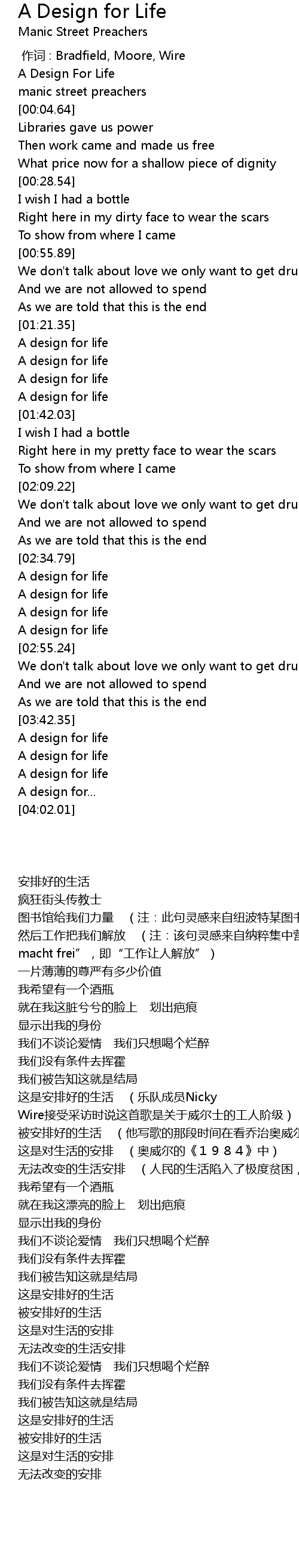 | [01:21.89] | 这是安排好的生活 (乐队成员Nicky Wire接受采访时说这首歌是关于威尔士的工人阶级) |