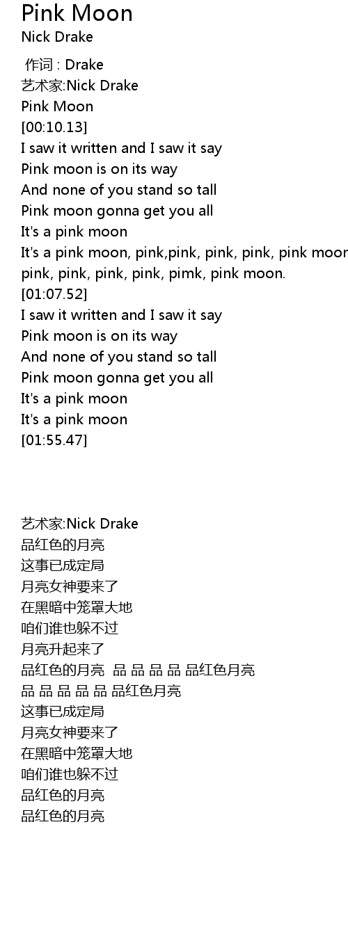 | [00:38.13] | It' s a pink moon, pink, pink, pink, pink, pink moon. |
