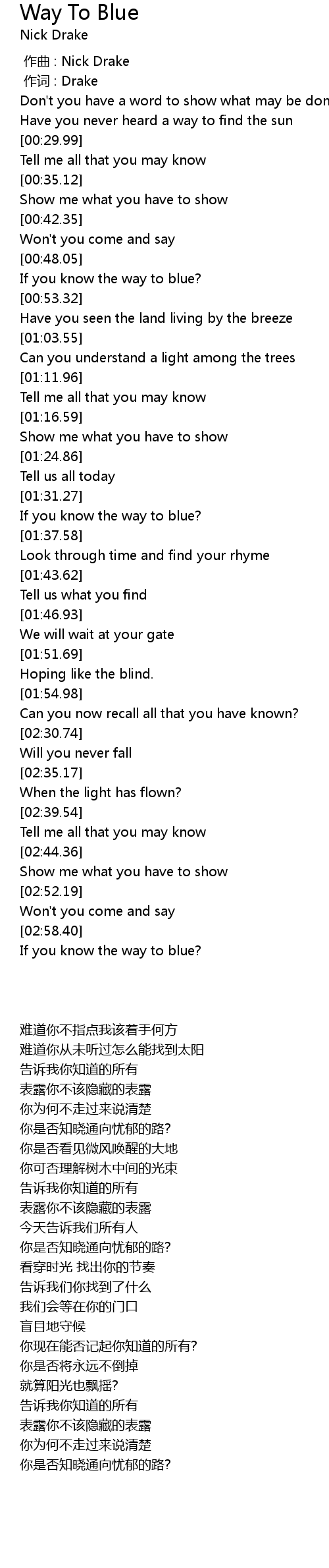 | [02:59.77] | If you know the way to blue? |
