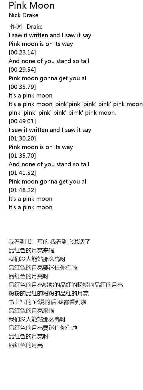 | [00:41.66] | It's a pink moon' pink'pink' pink' pink' pink moon. |