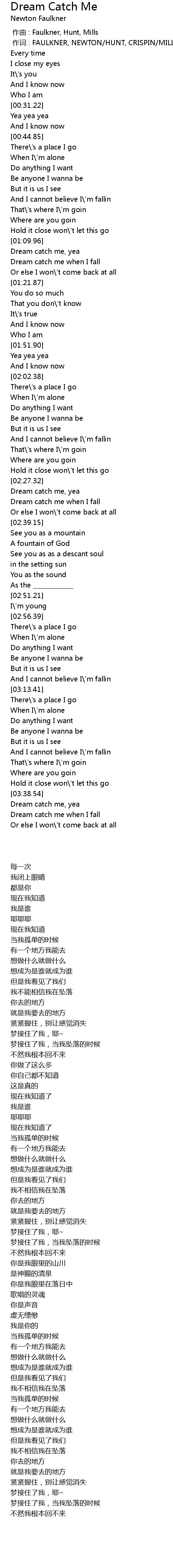 | [02:31.69] | Dream catch me when I fall |