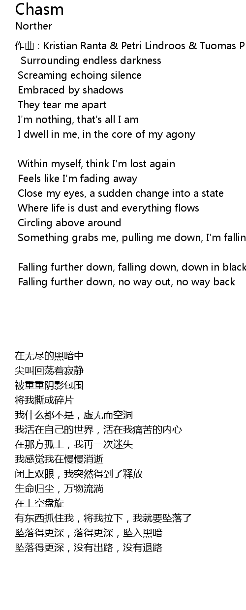 | [01:34.00] | 坠落得更深,落得更深,坠入黑暗 |