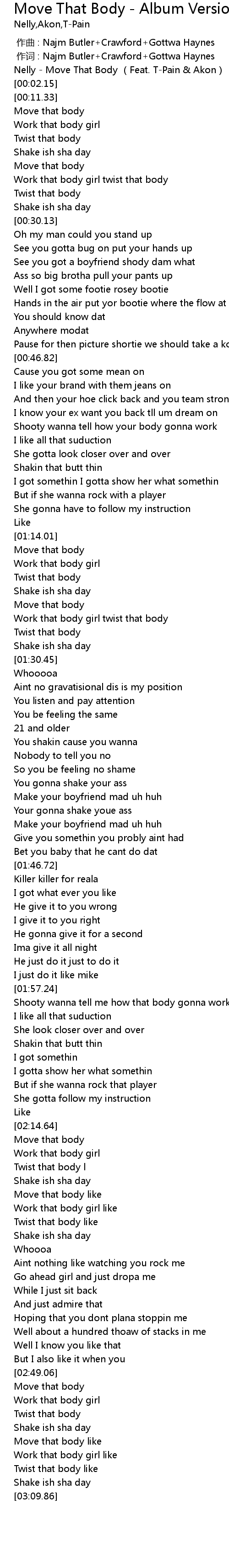 | [00:01.09] | Nelly Move That Body Feat. TPain Akon |