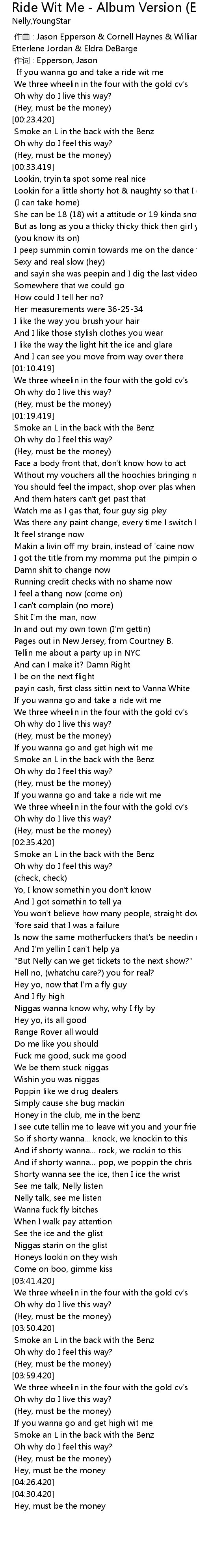 | [02:25.420] | If you wanna go and take a ride wit me |