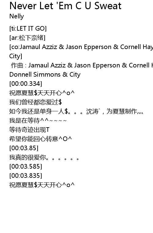 | [00:00.00] | zuò qǔ : Jamaul Azziz Jason Epperson Cornell Haynes Nelly Donnell Simmons City |
