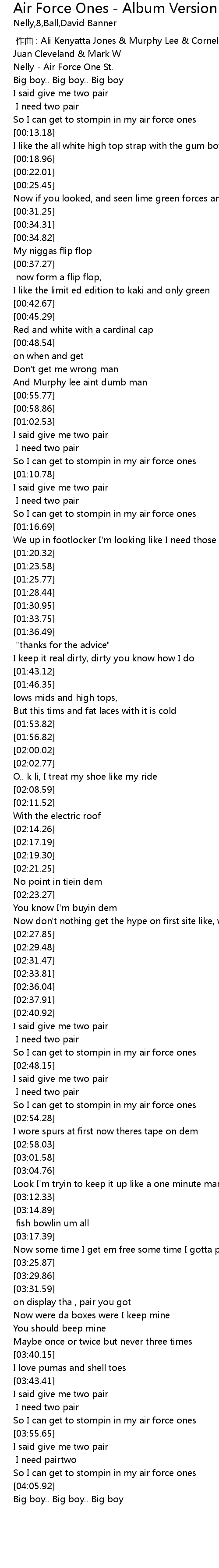 | [00:10.39] | So I can get to stompin in my air force ones |