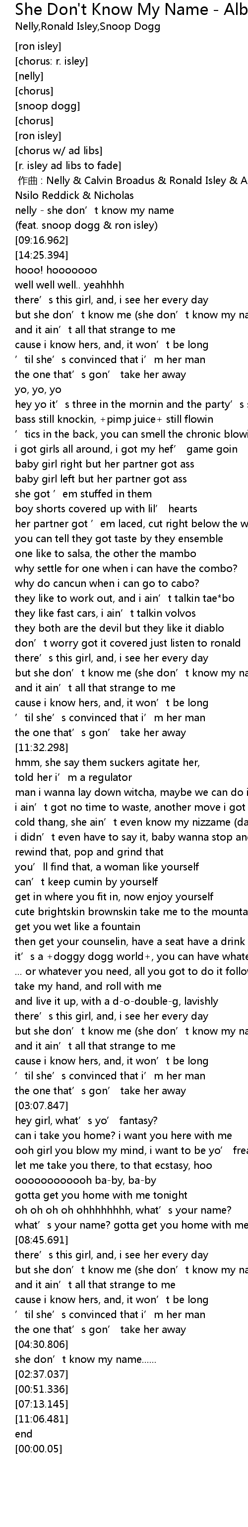 | [00:00.00] | 作曲 : Nelly & Calvin Broadus & Ronald Isley & Antwan Patton & Nsilo Reddick & Nicholas |