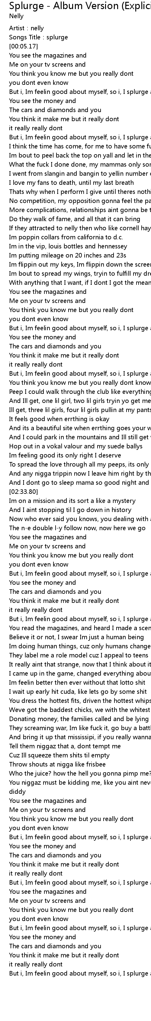 | [02:54.37] | But i, Im feelin good about myself, so i, I splurge a lil hell |