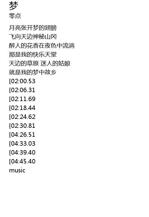 | [05:09.86][04:45.40][02:54.86] | zai meng li wo men fei xiang yuan fang |