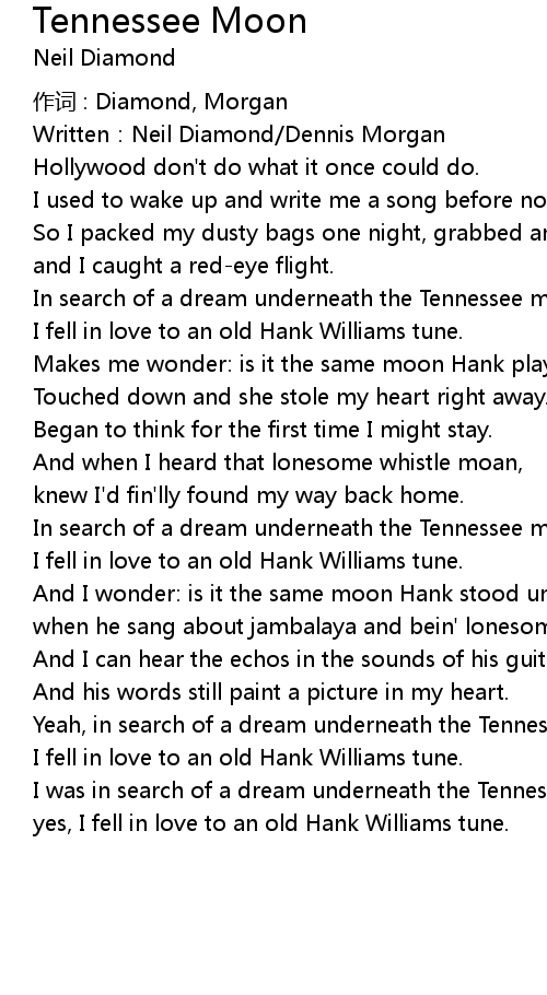| In search of a dream underneath the Tennessee moon, | |