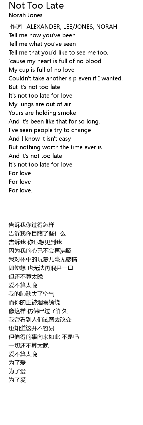| [00:00.00] | 作词 : ALEXANDER, LEE/JONES, NORAH |