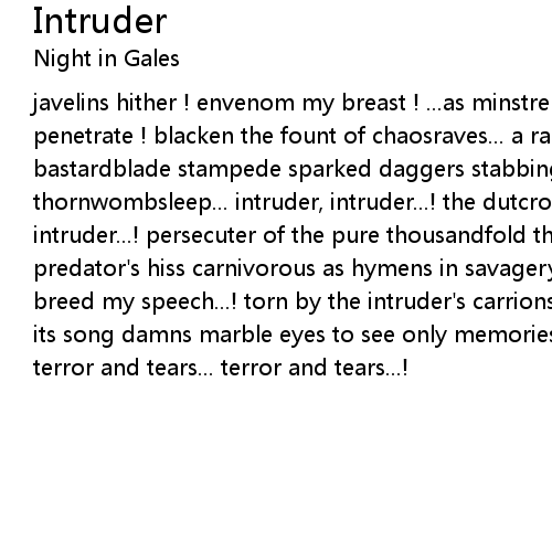javelins hither ! envenom my breast ! ...as minstrels of pestilence intrude ! penetrate ! blacken the fount of chaosraves... a rapturous onslaught bastardblade stampede sparked daggers stabbing onward to each and every thornwombsleep... intruder, intruder...! the dutcrown is yours intruder, intruder...! persecuter of the pure thousandfold thunderkiss a deathborn predator's hiss carnivorous as hymens in savagery and skyclad words of furious breed my speech...! torn by the intruder's carrionscythe a bewildering razorharp its song damns marble eyes to see only memories of nightfall's feast that brings terror and tears... terror and tears...! |