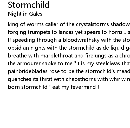 king of worms caller of the crystalstorms shadowfaced armourer father of mine forging trumpets to lances yet spears to horns... stormchild ! eat my fevermind !! speeding through a bloodwrathsky with the stormchild aside conquering obsidian nights with the stormchild aside liquid galaxies and shattered suns i breathe with marblethroat and firelungs as a chronicler of the equinox yet, when the armourer sapke to me "it is my steelclwas that you breathe!" a million painbrideblades rose to be the stormchild's meadowsweet so the furyhorde quenches its thirst with chaosthorns with whirlwindwords from tempesttongues born stormchild ! eat my fevermind ! |