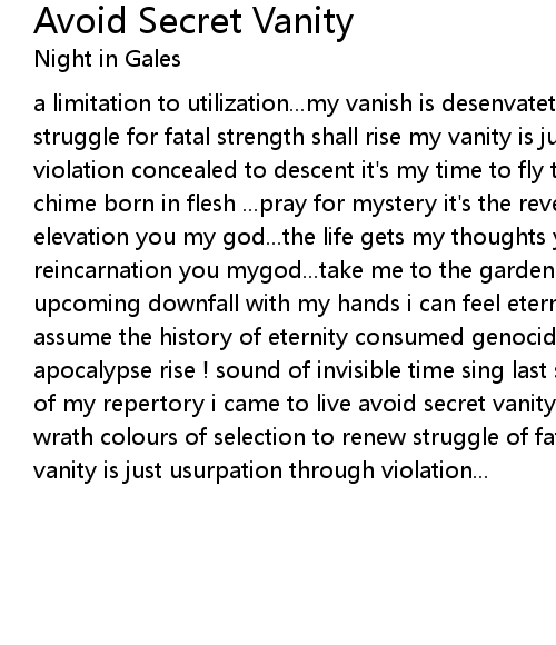 a limitation to utilization...my vanish is desenvatet by semblance...of banish struggle for fatal strength shall rise my vanity is just usurpation through violation concealed to descent it's my time to fly through born horizons bells chime born in flesh ...pray for mystery it's the revelation my throne of elevation you my god...the life gets my thoughts you my god...give my reincarnation you mygod...take me to the garden of origin you my god...of upcoming downfall with my hands i can feel eternity went to empty skies to assume the history of eternity consumed genocide made this part mightiest apocalypse rise ! sound of invisible time sing last souls' songs get the speech of my repertory i came to live avoid secret vanity just heard the burden of wrath colours of selection to renew struggle of fatal strength shall rise my vanity is just usurpation through violation... |