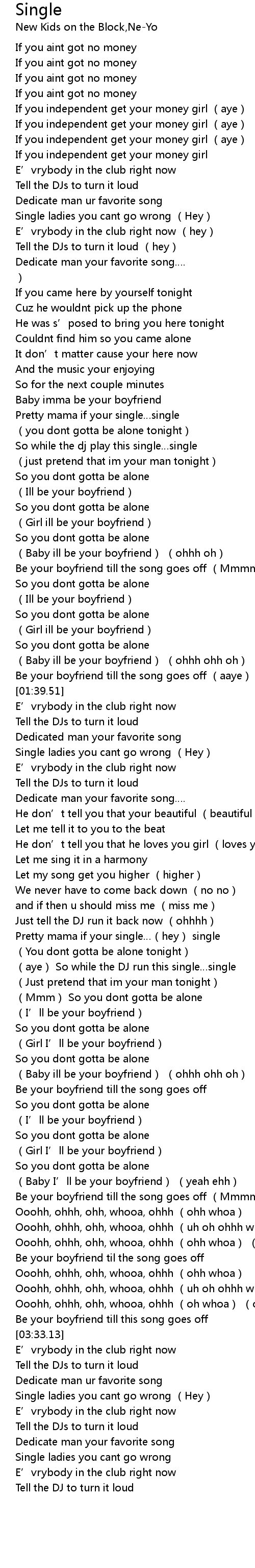 | [03:40.24] | Single ladies you cant go wrong (Hey) |