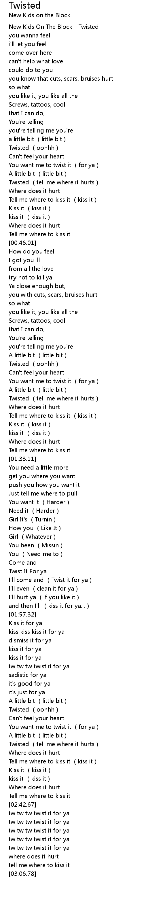 | [00:33.13] | Twisted (tell me where it hurts) |