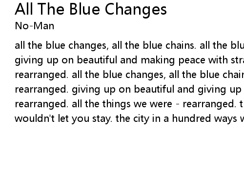 | all the blue changes, all the blue chains. all the blue changes rearranged. giving up on beautiful and making peace with strange, all the blue changes rearranged. all the blue changes, all the blue chains. all the blue changes rearranged. giving up on beautiful and giving up on pain. all the blue changes rearranged. all the things we were - rearranged. the city in a hundred ways, it wouldn't let you stay. the city in a hundred ways would never let you stray. |