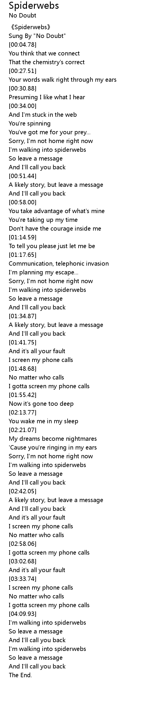 | [00:00.91] | 《Spiderwebs》 |
