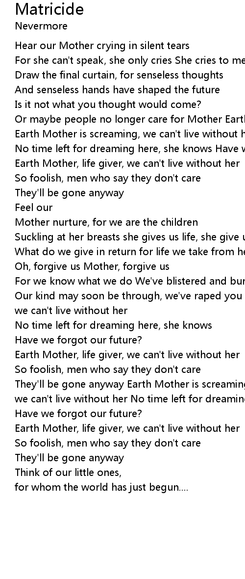 Our kind may soon be through, we've raped you Earth Mother is screaming, |
