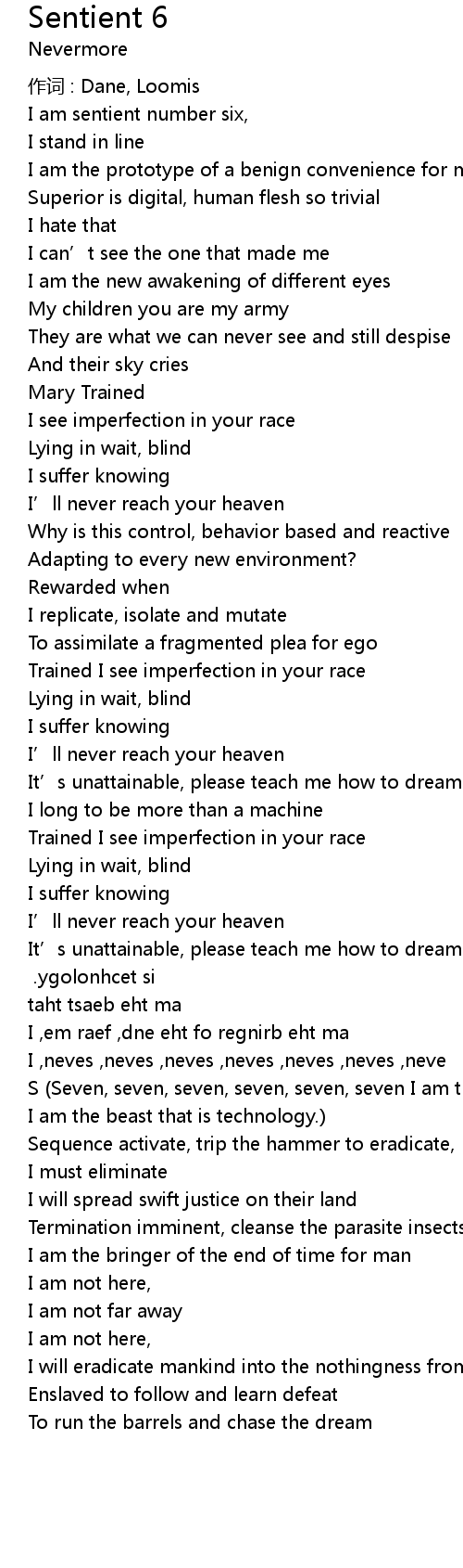 | [4:43 - 4:59] | I long to be more than a machine backwards lyrics . ygolonhcet si taht tsaeb eht ma |