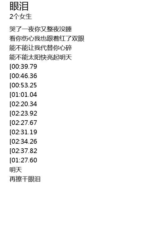 | [02:41.98][01:27.60] | děng míng tiān wǒ men zài cā gān yǎn lèi |