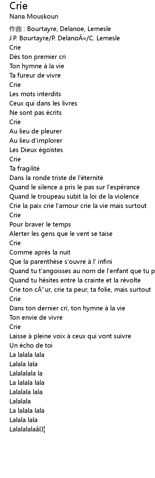 | Crie la paix crie l' amour crie la vie mais surtout | |