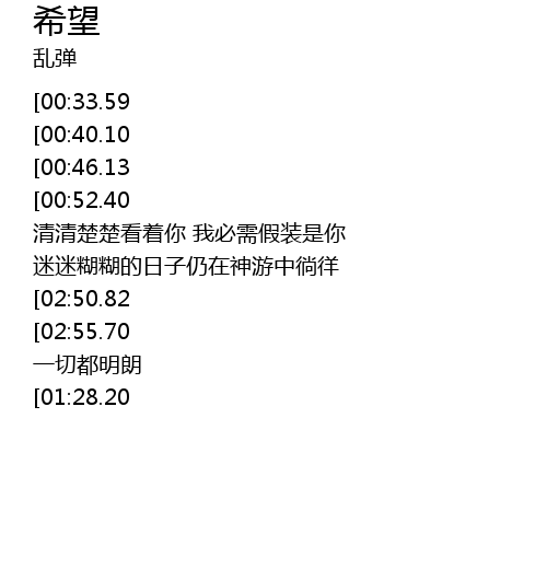 | [03:02.67][02:50.82][02:38.52][02:26.21][01:14.46] | 纷飞吧 我的希望 |