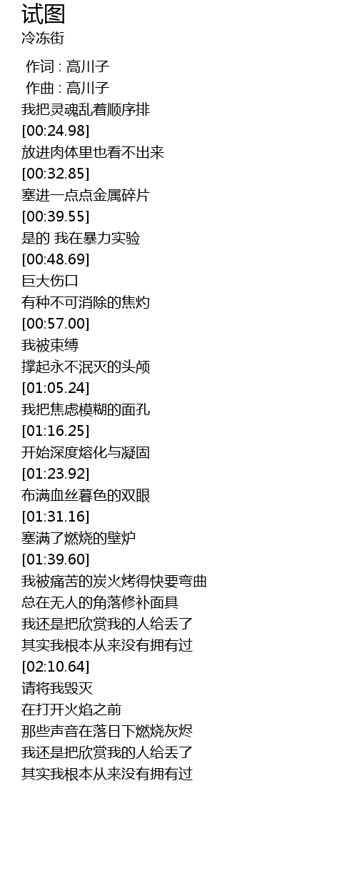 | [01:41.81] | 我被痛苦的炭火烤得快要弯曲 |