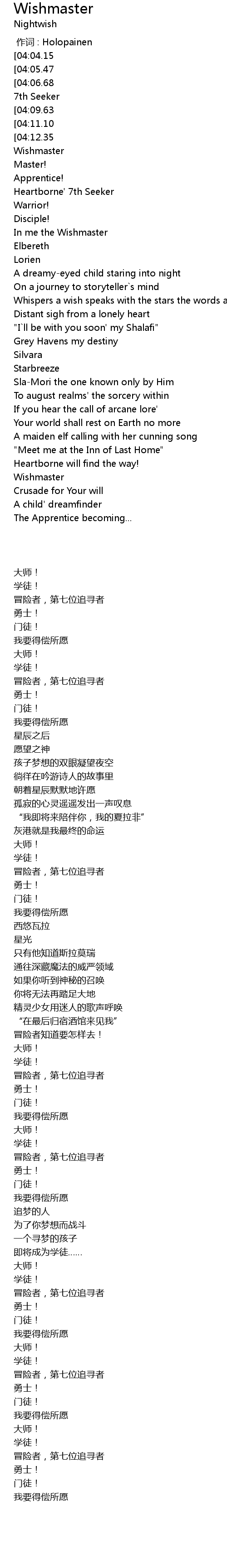 | [01:10.64][04:12.35][04:01.31][03:50.24][02:12.74][02:01.54][00:08.72] | In me the Wishmaster |
